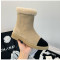 스웨이드 브라운 색상의 신발과 검정색 더블 C 로고, 목 부분을
