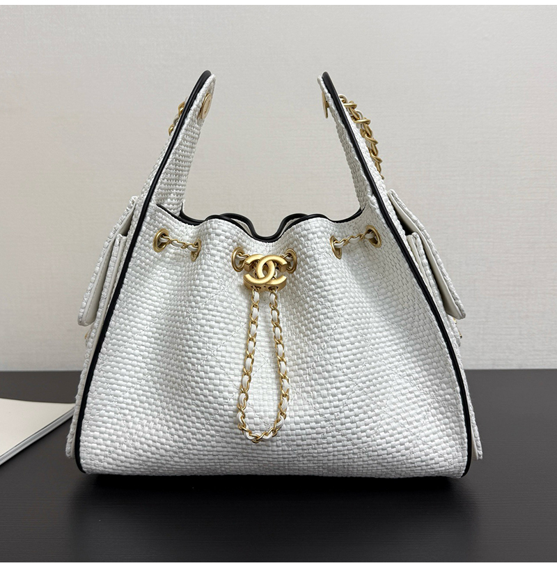 클래식한 버킷백 디자인, 퀼팅 패턴 ,드로우스트링, 더블 C